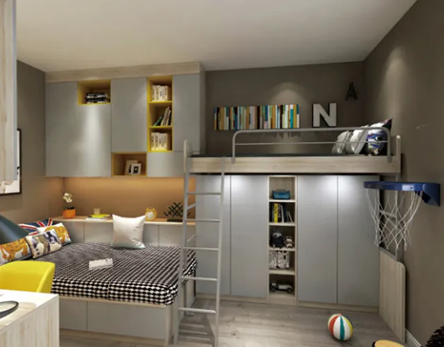 科菲笛将儿童房打破常规布局,以创新的手法将飘窗打造成另一片小天地,用心为孩子设计出一个光线充足的学习空间。儿童房合理规划收纳空间,能将书籍、玩具、以及衣物有序的存放,既增加了居室的空间感、便捷性,还给孩子更多的活动范围,提供一个舒适自在的成长环境。