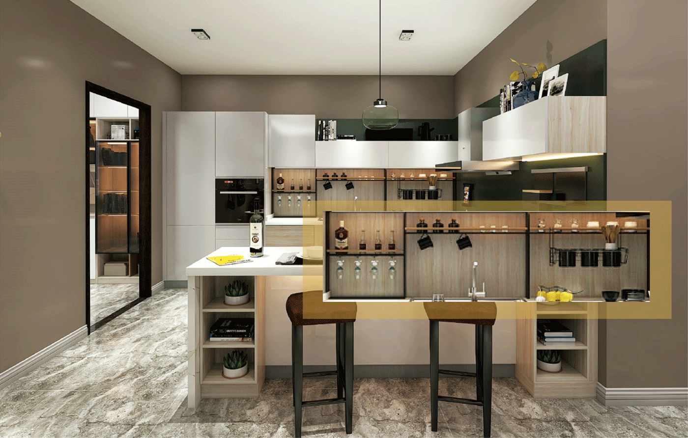 开放式厨房因其通透的空间感,充足的交流协作而成为当今厨房设计的主流。而开放式厨房中除了厨柜的选择外,合理的布局陪衬设计也至关重要。